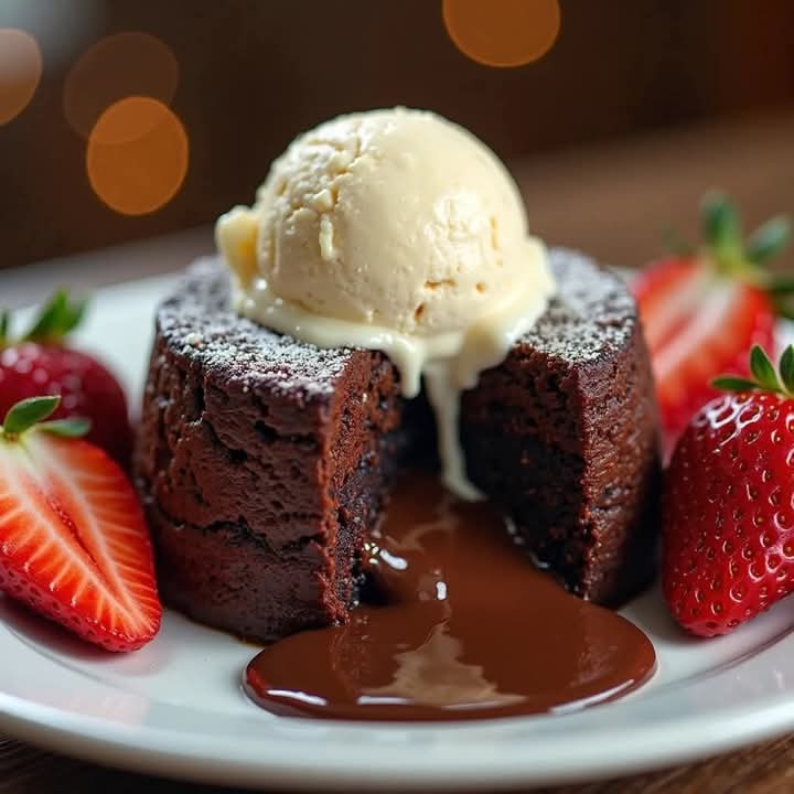 Rich Chocolate Lava Cake with Vanilla Ice Cream & Strawberries