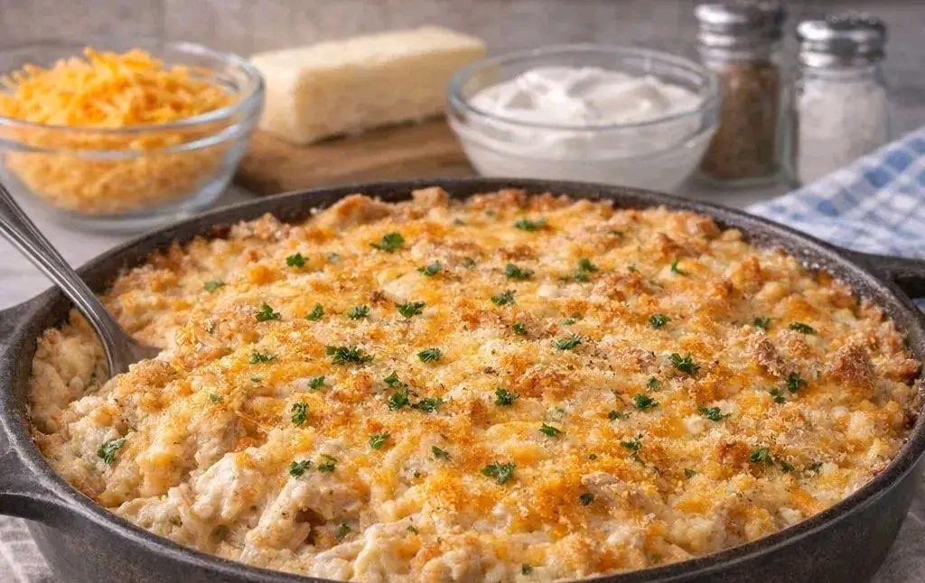 This casserole is creamy, cheesy, and packed with tender chicken and soft potatoes. Every bite is rich and satisfying, with a comforting texture that makes it a crowd favorite.